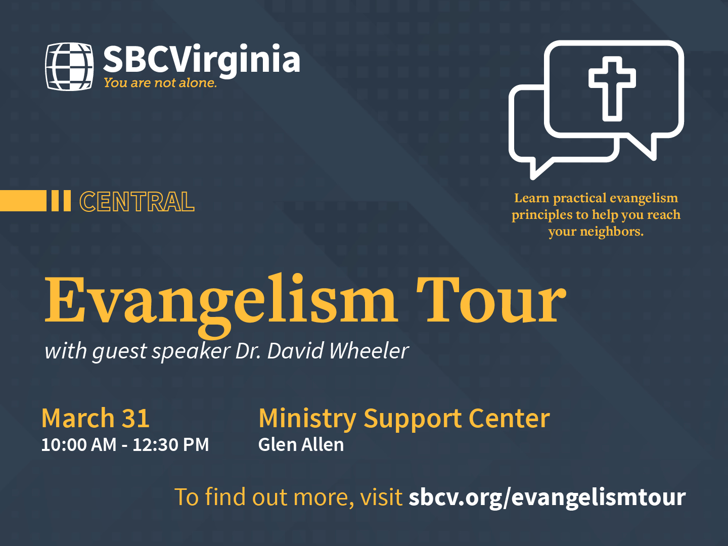 Learn practical evangelism principles to help you reach your neighbors followed by lunch and a Q&A session.